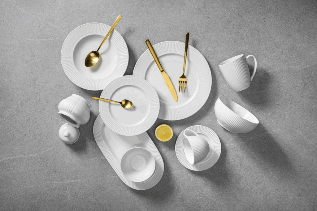 If your place is all about minimalism, loft vibes, or a modern look, then Scandi-style tableware works best—it’s all about earthy shades and being super functional. This aesthetic is defined by pure lines, matte textures, and motifs drawn from Nordic nature—delicate leaves, slender branches, and snow-inspired patterns. This is one of the most popular directions in dinnerware, so here are a few great examples: